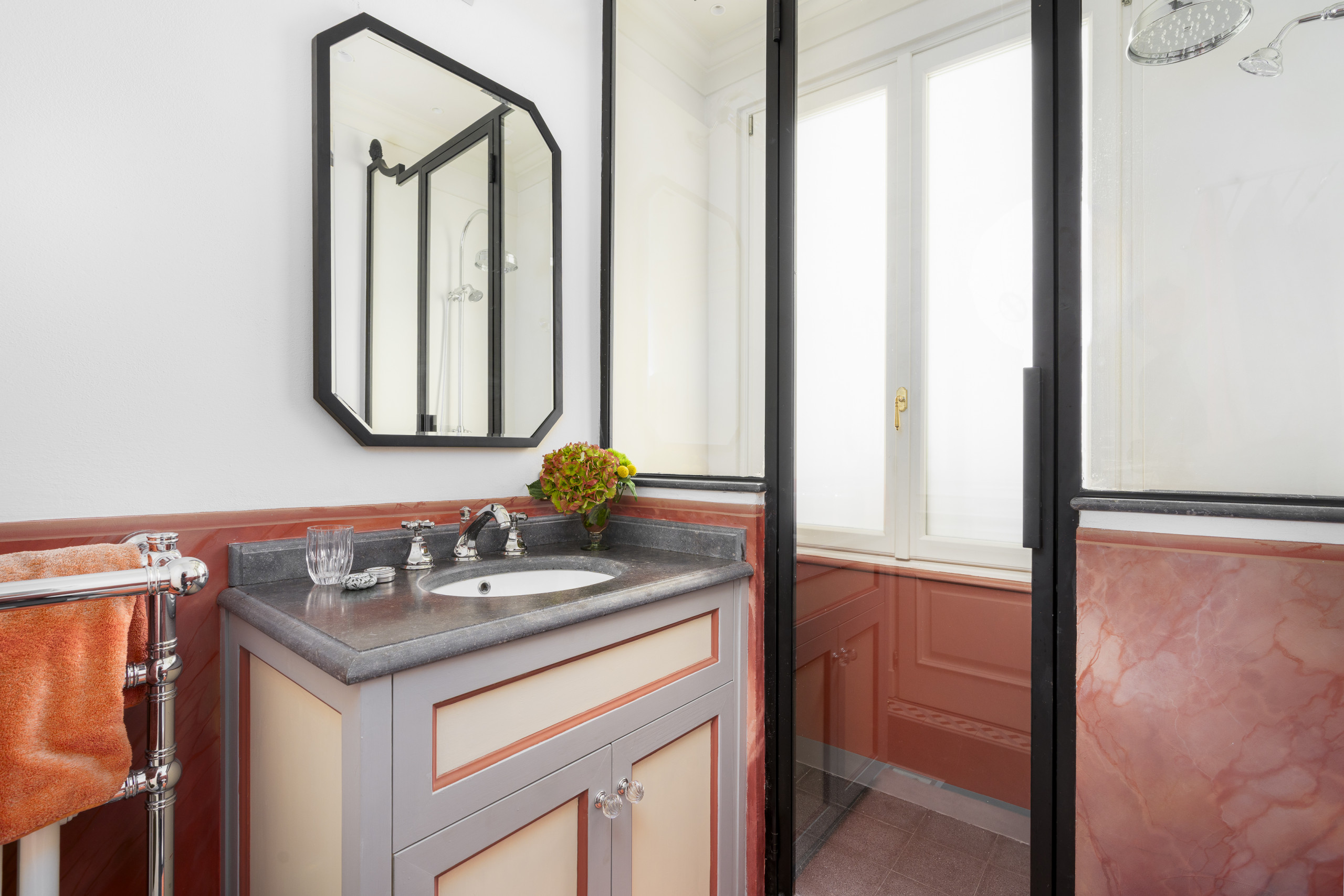 To the rear of the palazzo, a tranquil 3rd double bedroom in ivory and deep pinks with a double bed, an built-in wardrobe and an en suite bathroom with shower in grey and terracotta marble