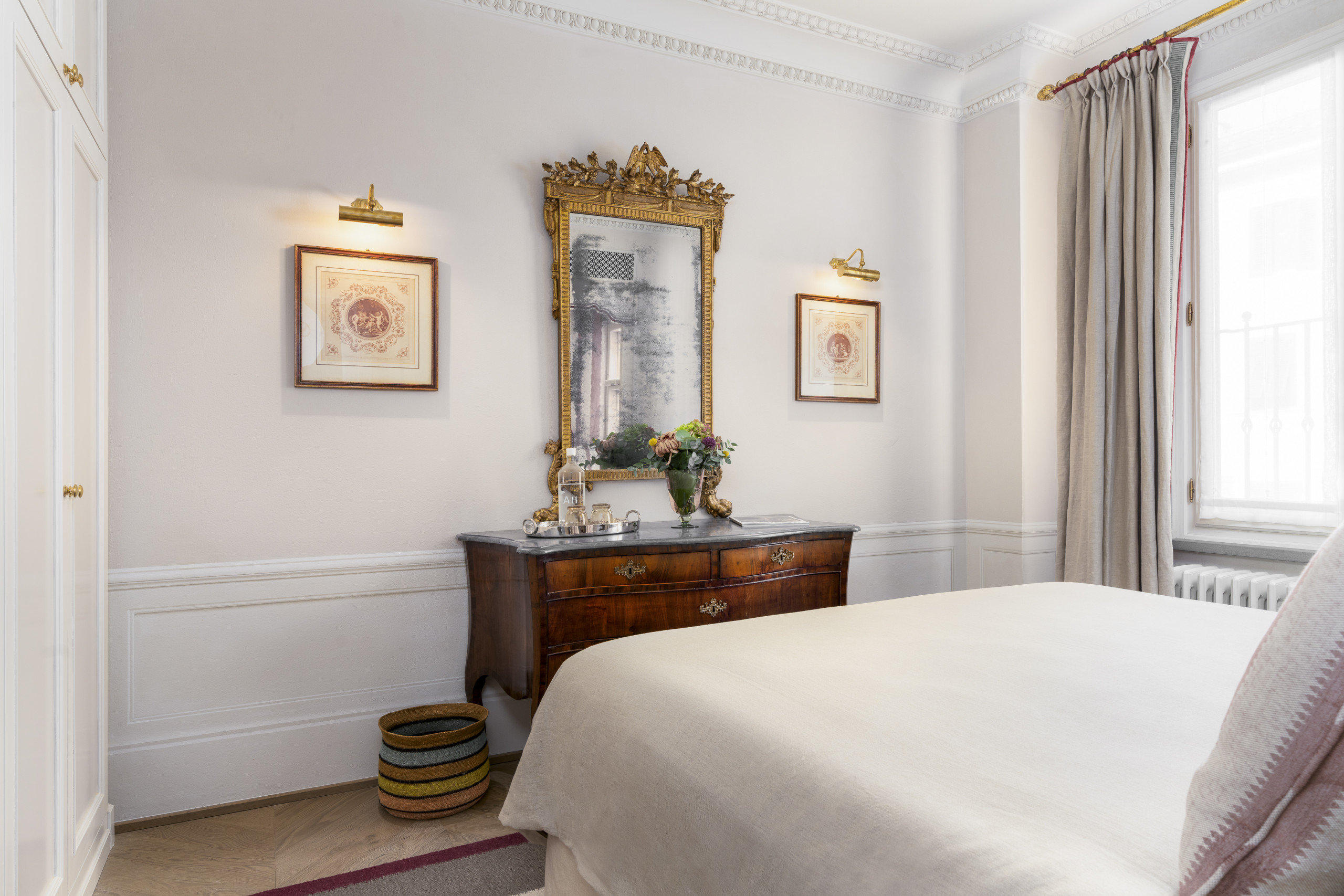 A supremely romantic and rather regal principal double with a traditional alcove sitting area, an opulently upholstered double bed, its own walk-in wardrobe, and a spacious and very sweet en suite bathroom in marble with freestanding classical-style bathtub and separate shower