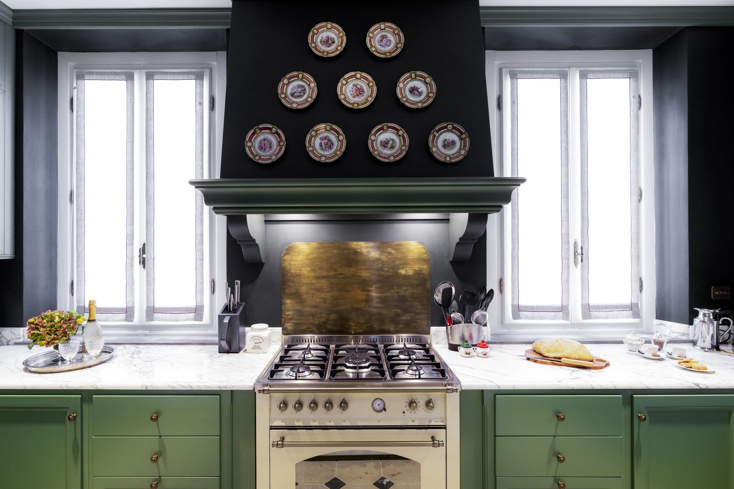 To the rear of the apartment, a superbly equipped traditional Tuscan kitchen / breakfast room in cheerful verdigris green with breakfast bar and cushioned stools, wine fridge (of course!), white marble worktops, and a cooking range set beneath a decorative mantel where you can work your magic on seasonal delicacies as you prepare to impress your fellow guests with your very own menù toscano del giorno!