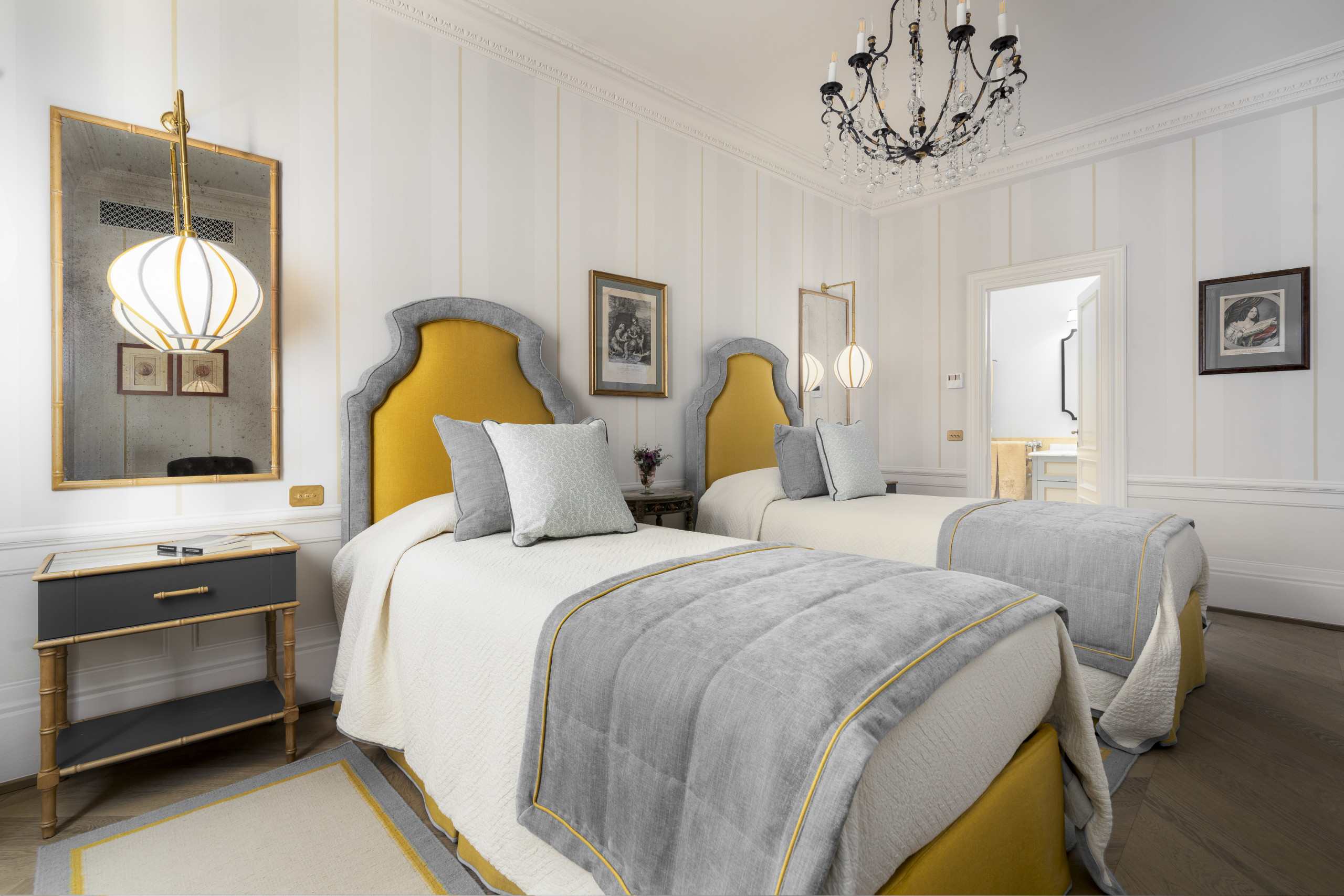 A relaxing and beautifully dressed 2nd double bedroom furnished with twin beds in Tuscan sunflower yellow and dove grey, a pair of oriental silk lamps casting a restful glow at close of day, its own walk-in closet and an en suite bathroom in vivid Giallo Siena marble with shower
