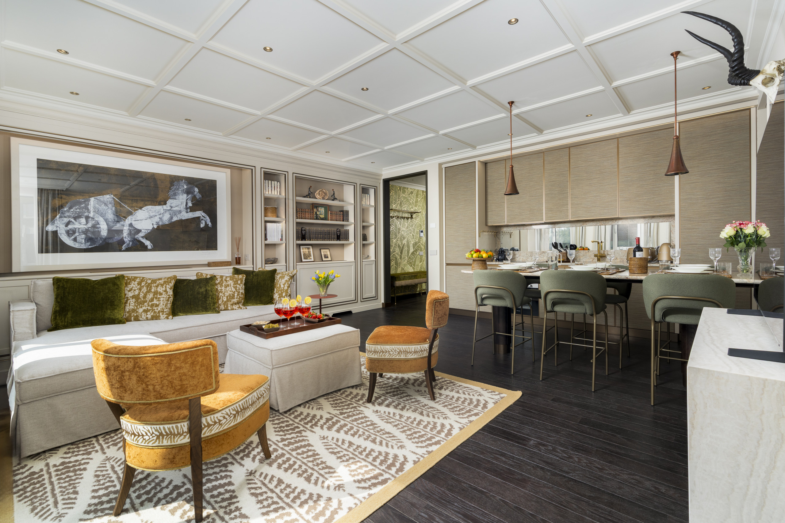 Ein stilvolles Wohnzimmer mit Blick auf die Via Tortona, meisterhaft eingerichtet in Safrangelb, Französischblau und Salbeigrün, mit zwei maßgefertigten Sofas – eines davon ein gemütliches Schlafsofa, das auf Wunsch in zwei Einzelbetten geteilt werden kann – und einem Paar eleganter Lampen, die einen goldenen Schimmer auf die Wandverkleidung „Japanese Cranes“ von IKSEL werfen, inspiriert von japanischen Wandschirmen.