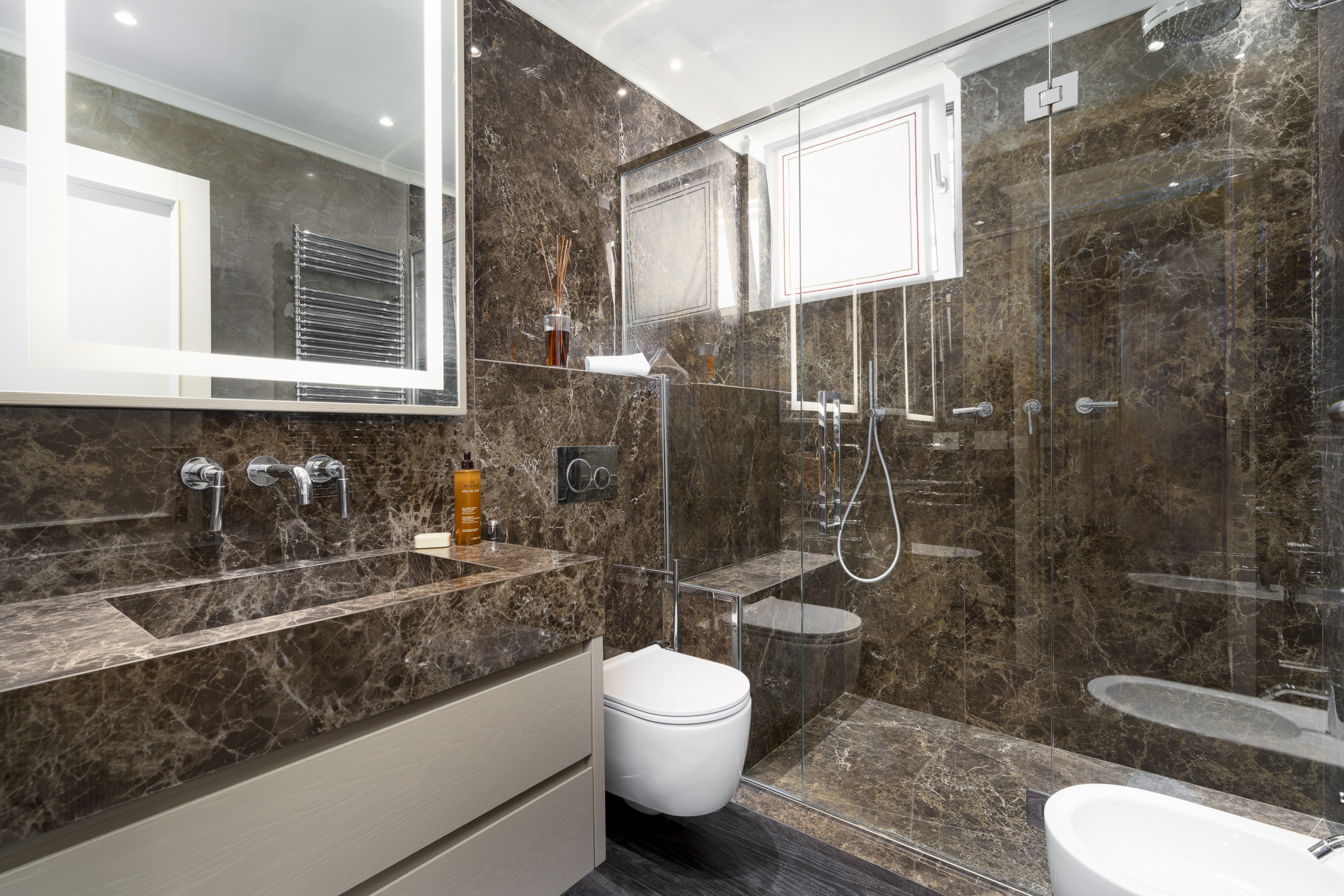 Ein luxuriöses Badezimmer, flankiert von verspiegelten Kleiderschränken, mit marmorierten Wänden, polierten Messingarmaturen und einer luxuriösen Marmordusche.