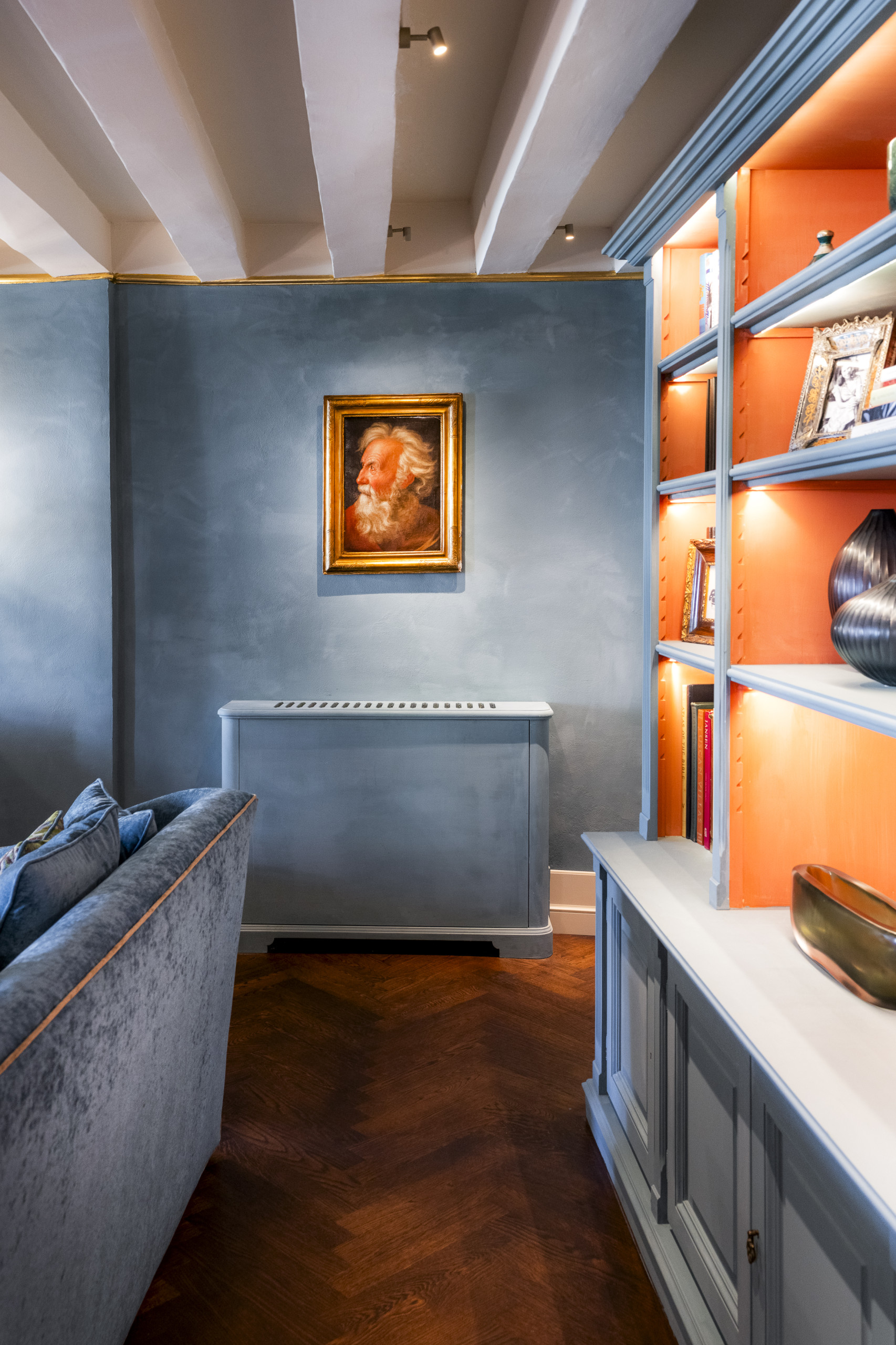 Beautifully presented in gentle blue polished marmorino and boasting warm wooden parquet flooring topped with a gorgeous antique Aubusson flatweave rug in coral pinks and ecru, the room is furnished with a pair of large velvet sofas and antique armchairs for carefree lounging, an array of much-loved family heirlooms, contemporary Murano glassware by Micheluzzi Glass dotted here and there (do go visit Massimo Micheluzzi’s showroom beside the Ponte delle Maravegie near the Accademia – divine!) ... not forgetting a rather splendid, framed copy of Canaletto’s oil on canvas entitled ‘Venice: The Grand Canal from the Palazzo Foscari to the Carità’ (1740-1750) depicting Palazzo Loredan dell’ Ambasciatore at its very centre – do see if you can spot it! (note the original can be viewed at The Wallace Collection in London)