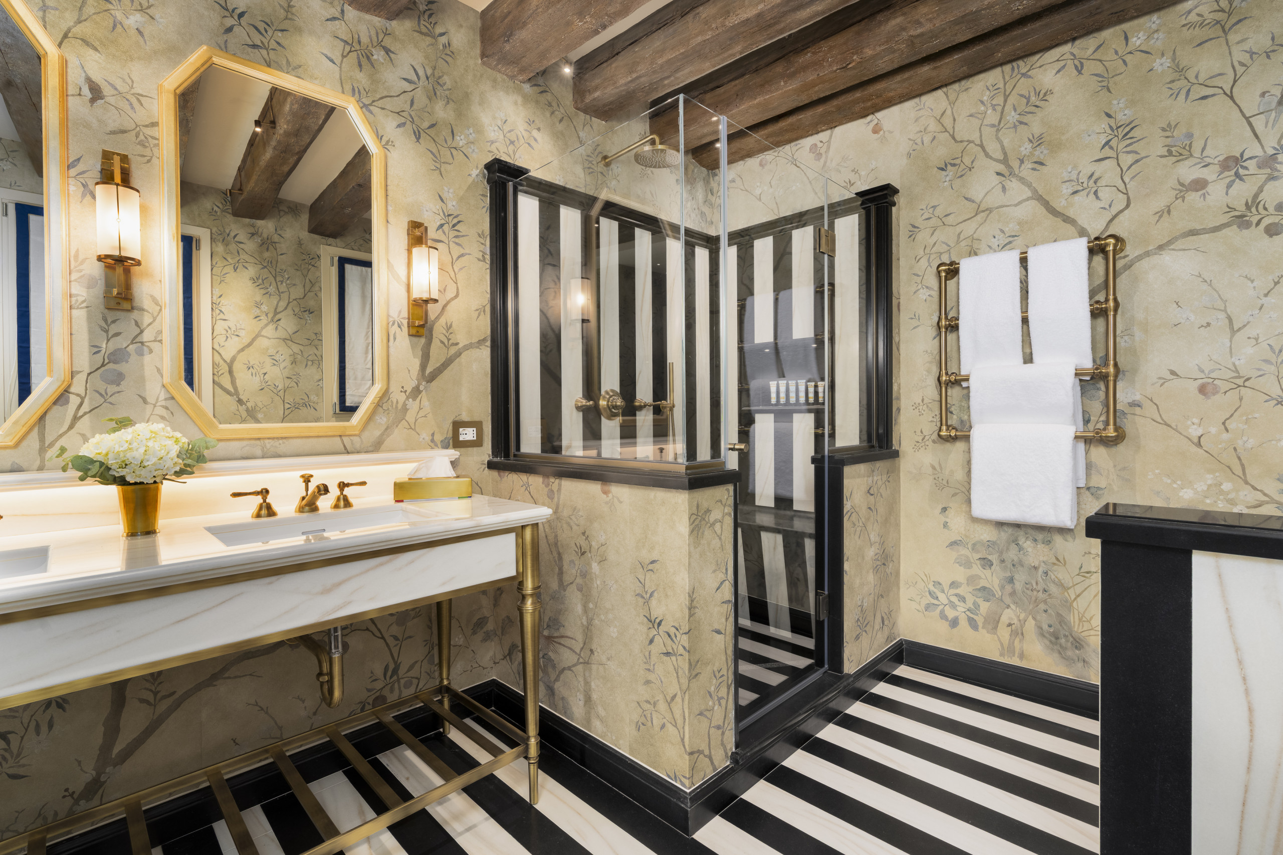 Custom-made by traditional Florentine woodworking specialists Falegnameria Matulli, the smart kitchen area with marble worktop is streamlined, uncluttered and features top-of the-range integrated appliances (including the ever-essential wine cooler cabinet), a groovy bespoke brass breakfast bar with matching stools where you can keep your personal chef company**, and a cleverly angled mirror overhead reflecting the light from the sparkling Grand Canal waters beyond... it’s the ‘place to be’ for evening aperitivi – just ask Filippo!