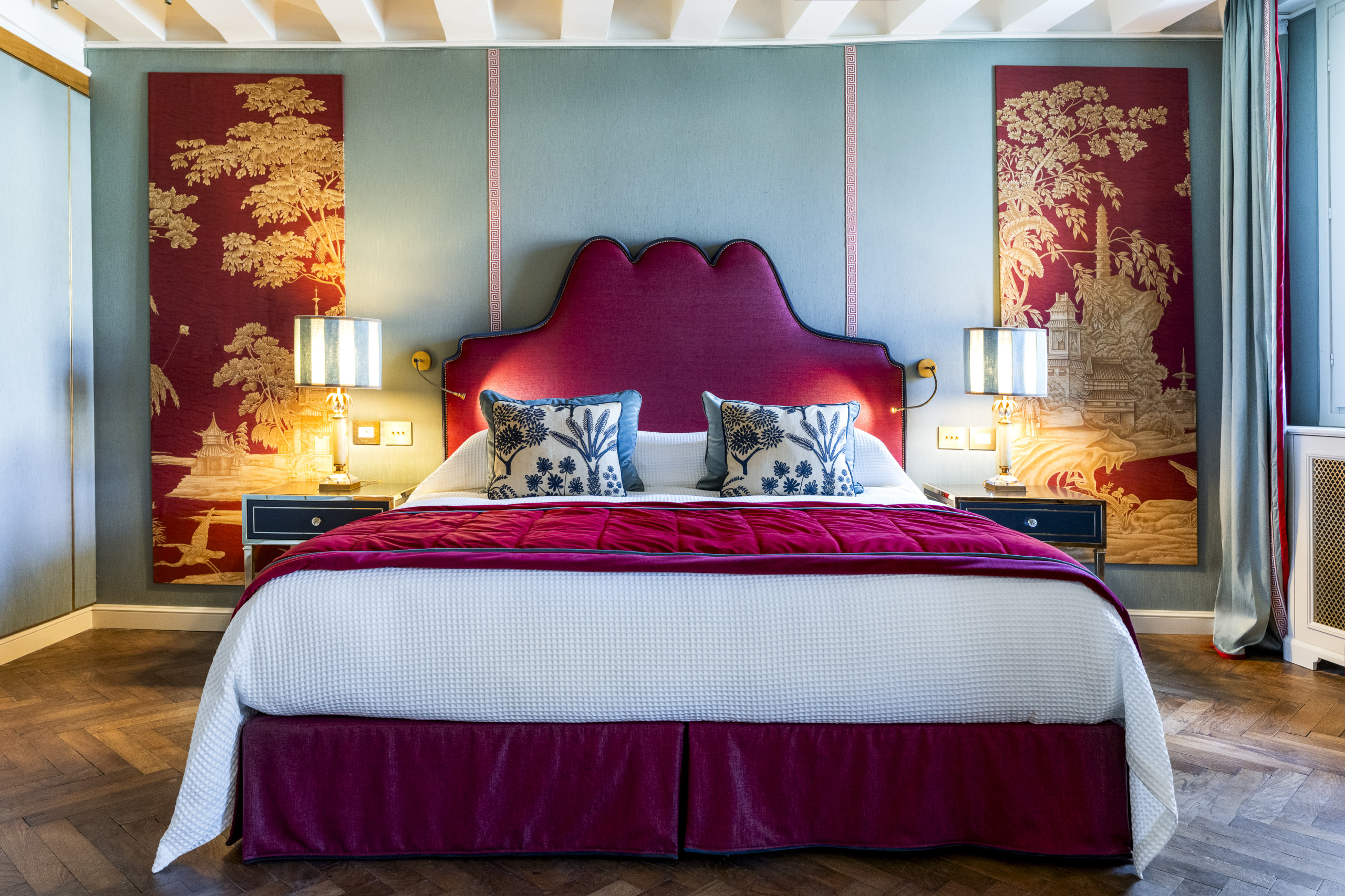 The bright, spacious and supremely elegant principal double bedroom – a vision in deep amarone red velvet and eau-de-nil with white-painted beams, warm wooden parquet flooring, built-in wardrobes, an enormously comfortable double bed flanked by a pair of oriental-style wall panels, and a truly breathtaking en suite bathroom in Zoffany’s Rotherby wallpaper with contrasting monochrome marble floor and panelling, a large and luxurious shower, twin wash basins in snow-white marble lit by deco-style lamps, burnished brass fittings throughout and a rolltop bathtub in gold. Note the double bed in this bedroom can be made into twins upon request