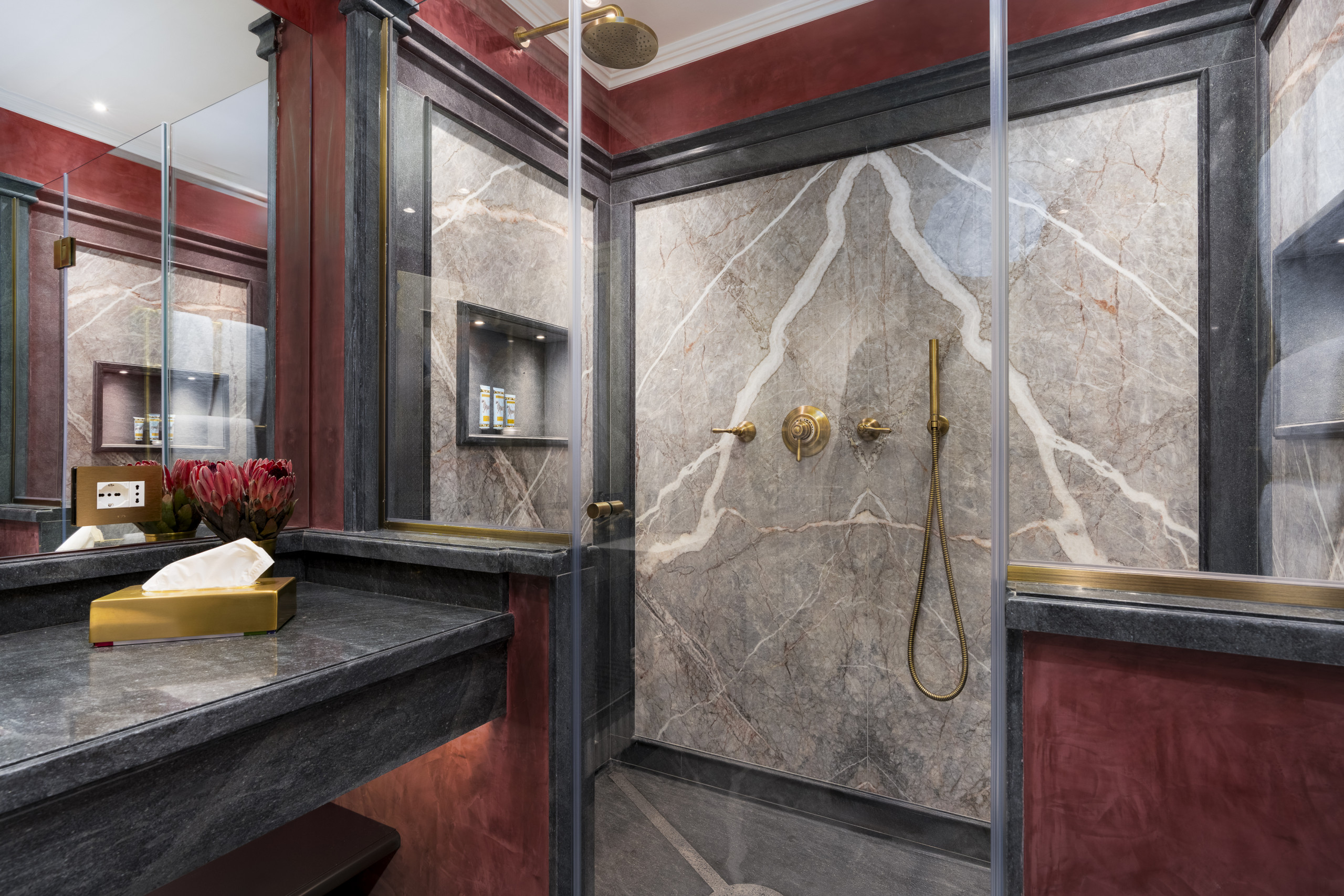Ein makelloses, modernes Badezimmer aus poliertem Marmor mit Dusche