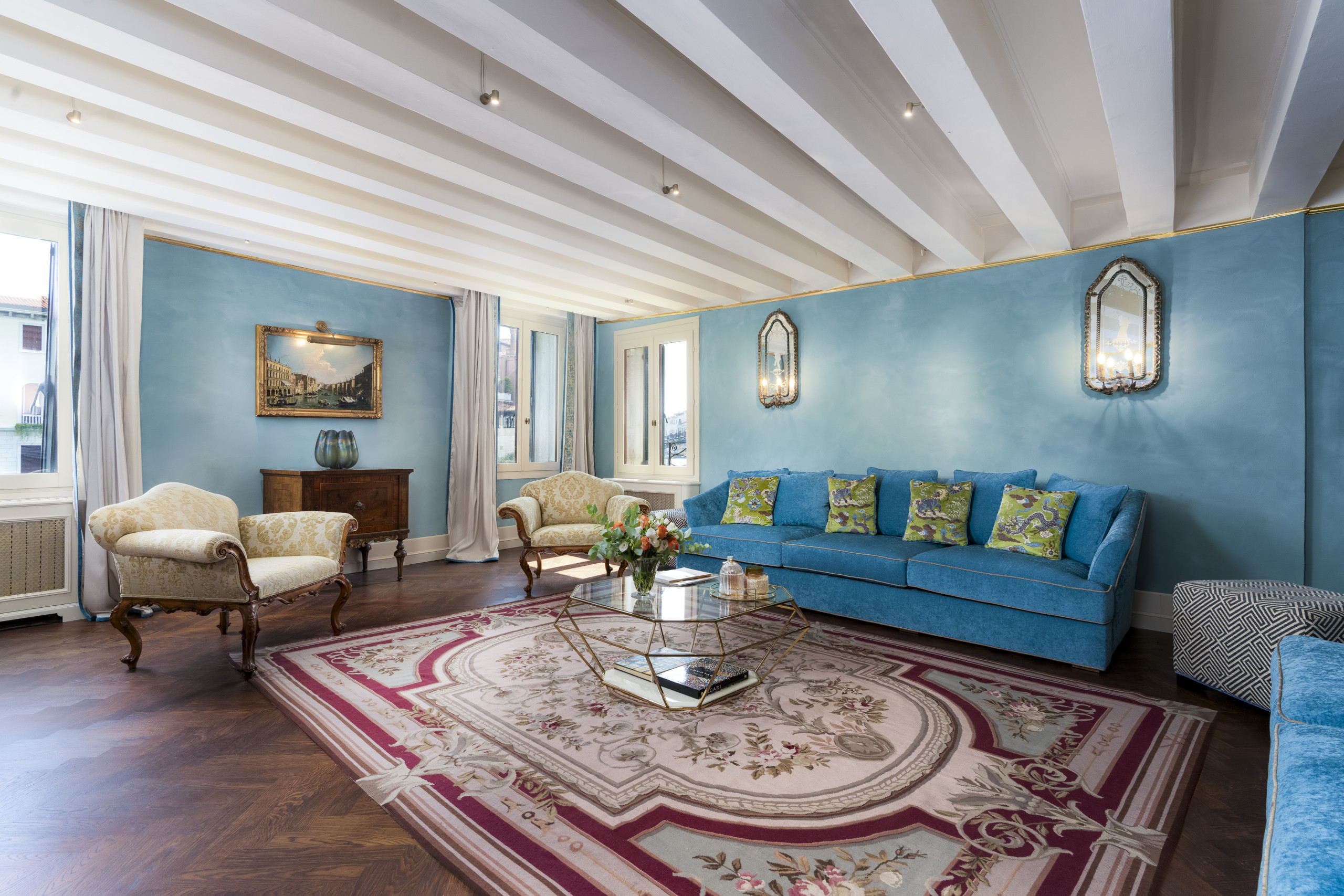 Palazzo Loredan Grand Canal’s fabulous dual aspect light-filled sitting room where the constantly shifting sights and sounds of the Grand Canal to the fore and the Accademia Bridge to the side provide a thrilling tableau of Venetian life on the water, which you can now be part of without stepping outside your door!