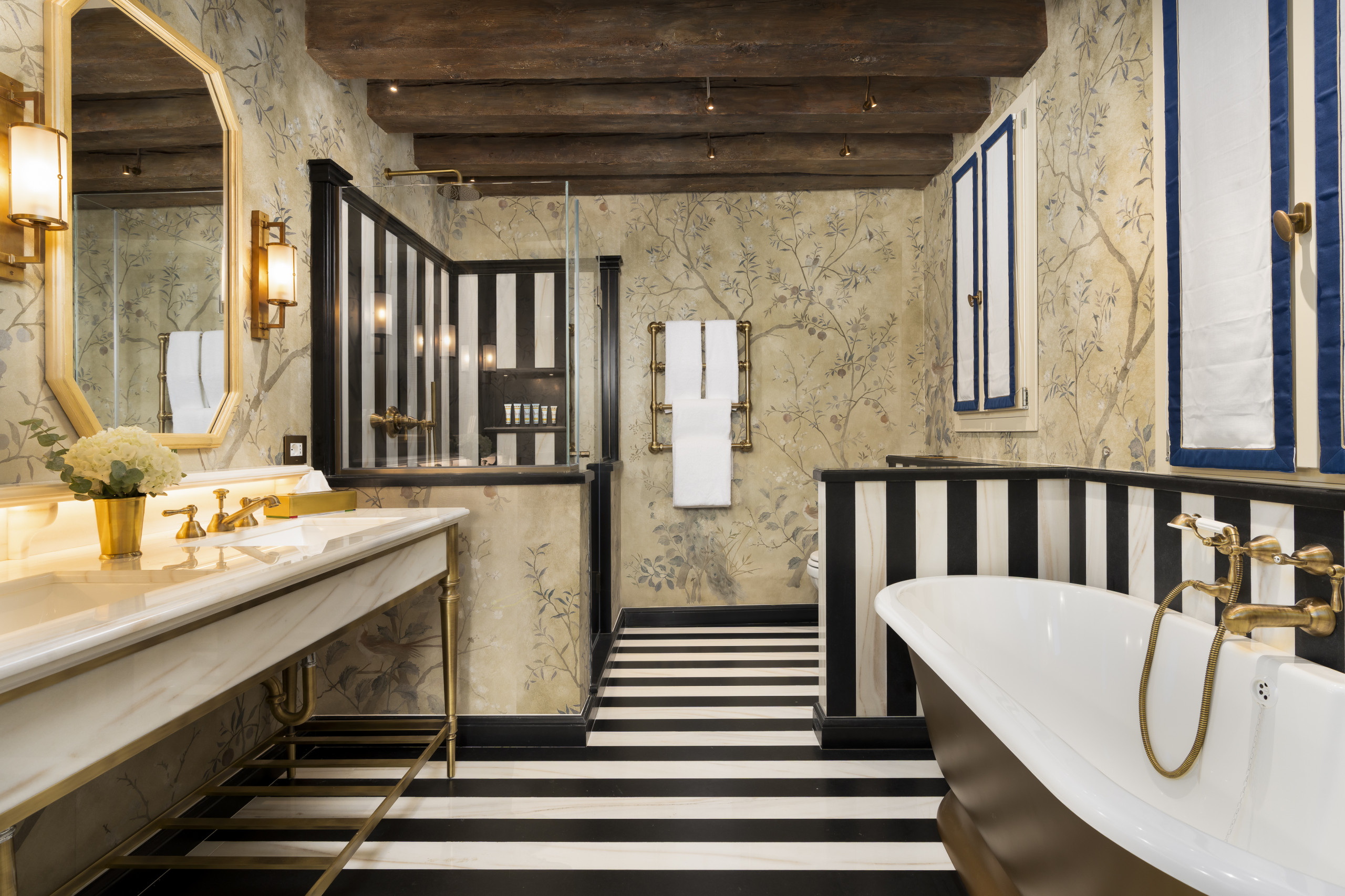 The bright, spacious and supremely elegant principal double bedroom – a vision in deep amarone red velvet and eau-de-nil with white-painted beams, warm wooden parquet flooring, built-in wardrobes, an enormously comfortable double bed flanked by a pair of oriental-style wall panels, and a truly breathtaking en suite bathroom in Zoffany’s Rotherby wallpaper with contrasting monochrome marble floor and panelling, a large and luxurious shower, twin wash basins in snow-white marble lit by deco-style lamps, burnished brass fittings throughout and a rolltop bathtub in gold. Note the double bed in this bedroom can be made into twins upon request