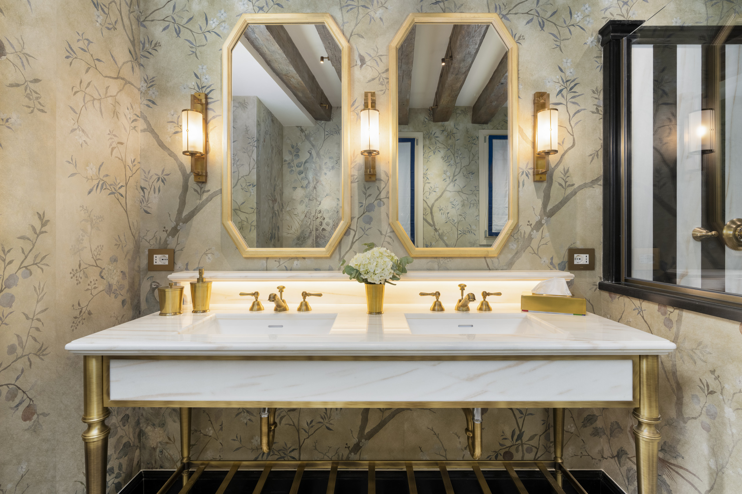 A private doorway into a dramatically embellished entrance hallway adorned from top-to-toe in hand-painted floral chinoiserie on gold leaf and featuring white-painted timbers overhead lit by Seguso vetri d’arte light sconces from the 60s – a true feat of Italian artistry and a ‘gasp aloud’ intro to the enchantment that lies ahead!