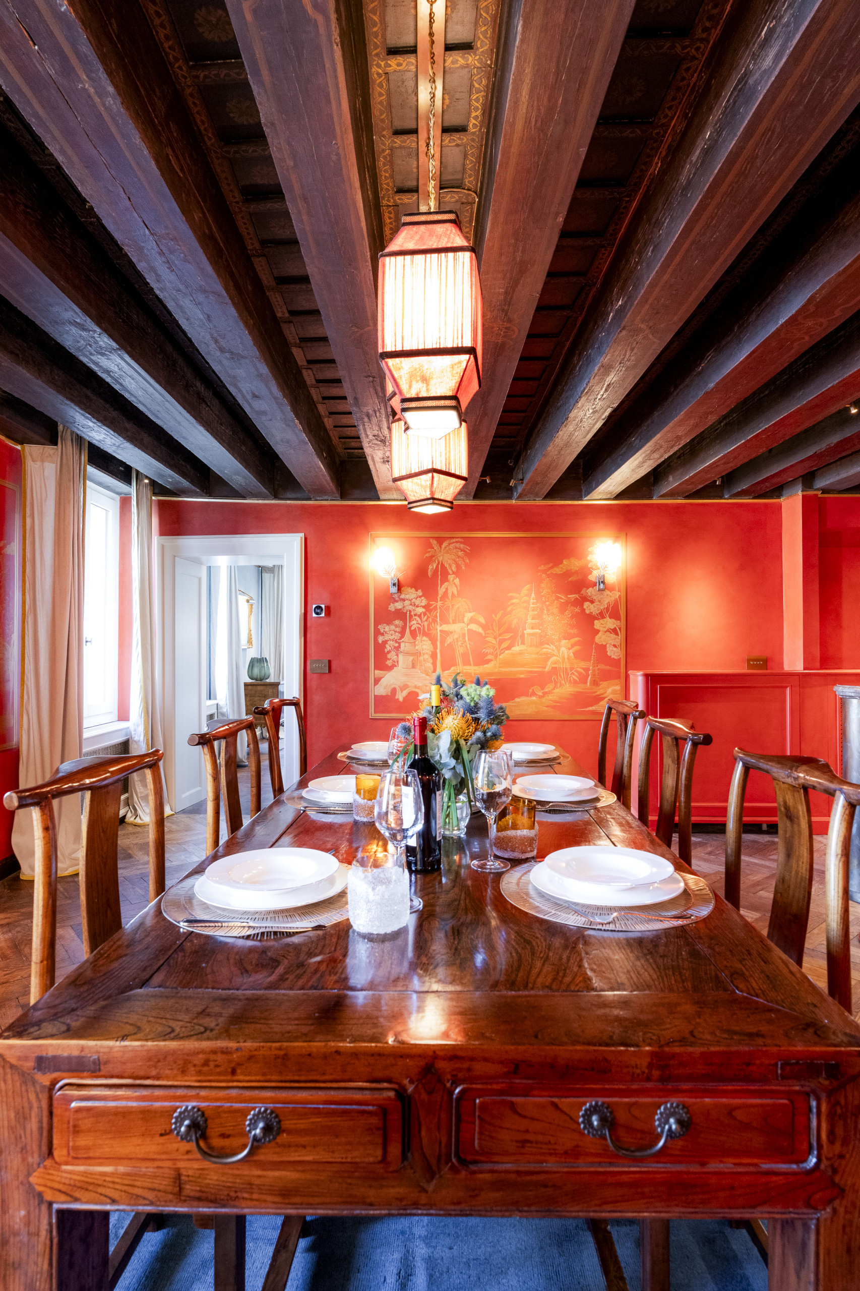 The bold and gloriously bohemian open-plan dining room / kitchen enrobed in a mystical cinnabar red and showcasing a series of delightful Marco Polo-inspired hand-crafted ‘pagoda’ wall-paintings in gold, dark aged timbers above further enhancing the room’s already deeply opulent atmosphere, and a dining suite hosting 8 guests set upon an antique blue and ecru Chinese Peking rug lit softly by a series of pretty, oriental pleated silk lamps