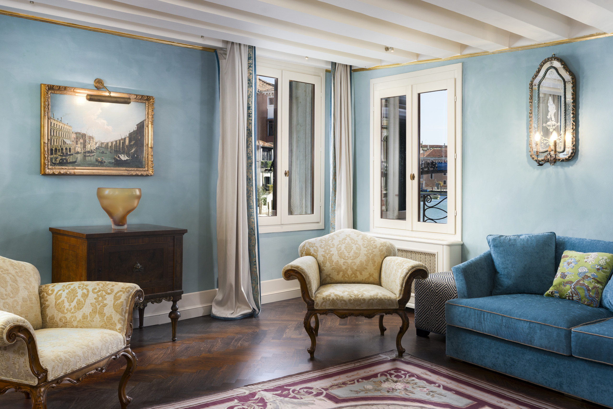 Beautifully presented in gentle blue polished marmorino and boasting warm wooden parquet flooring topped with a gorgeous antique Aubusson flatweave rug in coral pinks and ecru, the room is furnished with a pair of large velvet sofas and antique armchairs for carefree lounging, an array of much-loved family heirlooms, contemporary Murano glassware by Micheluzzi Glass dotted here and there (do go visit Massimo Micheluzzi’s showroom beside the Ponte delle Maravegie near the Accademia – divine!) ... not forgetting a rather splendid, framed copy of Canaletto’s oil on canvas entitled ‘Venice: The Grand Canal from the Palazzo Foscari to the Carità’ (1740-1750) depicting Palazzo Loredan dell’ Ambasciatore at its very centre – do see if you can spot it! (note the original can be viewed at The Wallace Collection in London)