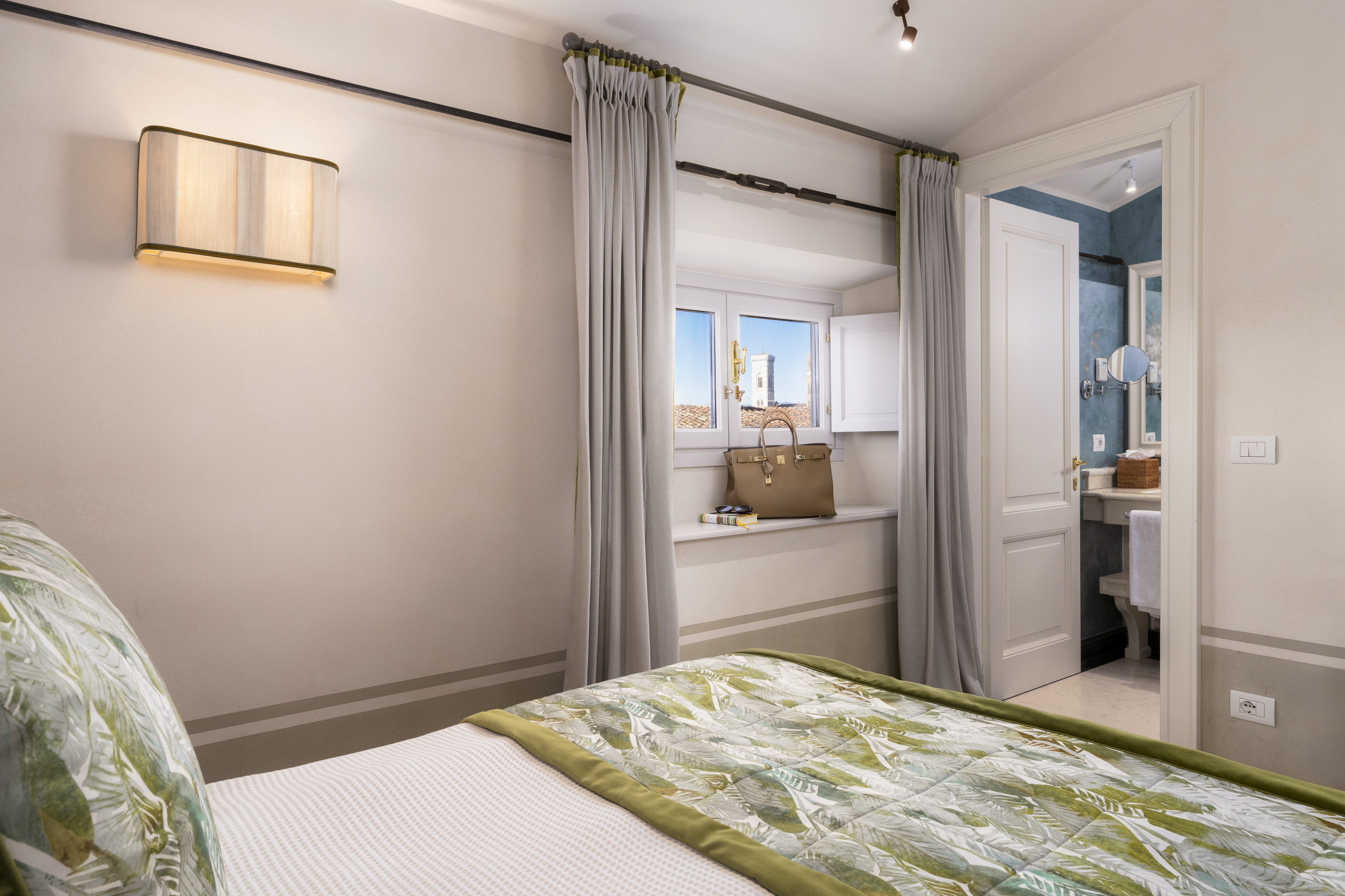 -Creata nel 2021 per aumentare fascino e comodità di questo appartamento, e offrire un accesso diretto (salendo alcuni gradini) alla soleggiata terrazza… un’elegantissima camera da letto padronale, arredata con una palette di colori lino e blu scuro, letto matrimoniale (trasformabile in letti gemelli su richiesta), un armadio a specchio e un lussuoso bagno privato in Marmorino blu scuro con vasca da bagno rivestita in marmo, doccia separata e un piccolo terrazzo che si affaccia su un cortile privato
