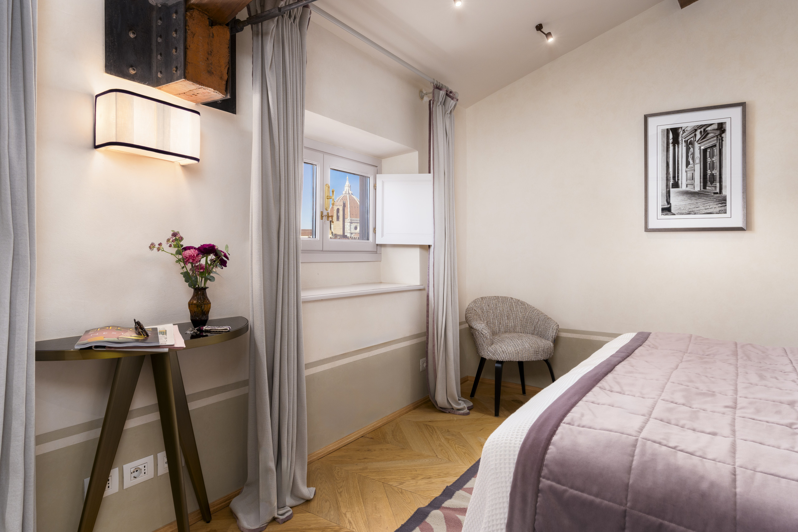 E alla fine del corridoio interno che ospita armadi su misura... una terza camera da letto matrimoniale accogliente e invitante che gode di ancora più (!) viste sui tetti di Palazzo Vecchio e del Duomo, arredata con letti singoli rivestiti in tonalità di blu-grigio (sui quali potrete gradualmente addormentarvi ammirando le colline sopra Firenze attraverso la piccola finestra che si trova proprio accanto a uno dei letti!), e con il proprio bagno en-suite in marmo e marmorino lucido con doccia a pioggia avvolto in piastrelle in ceramica blu a diamante