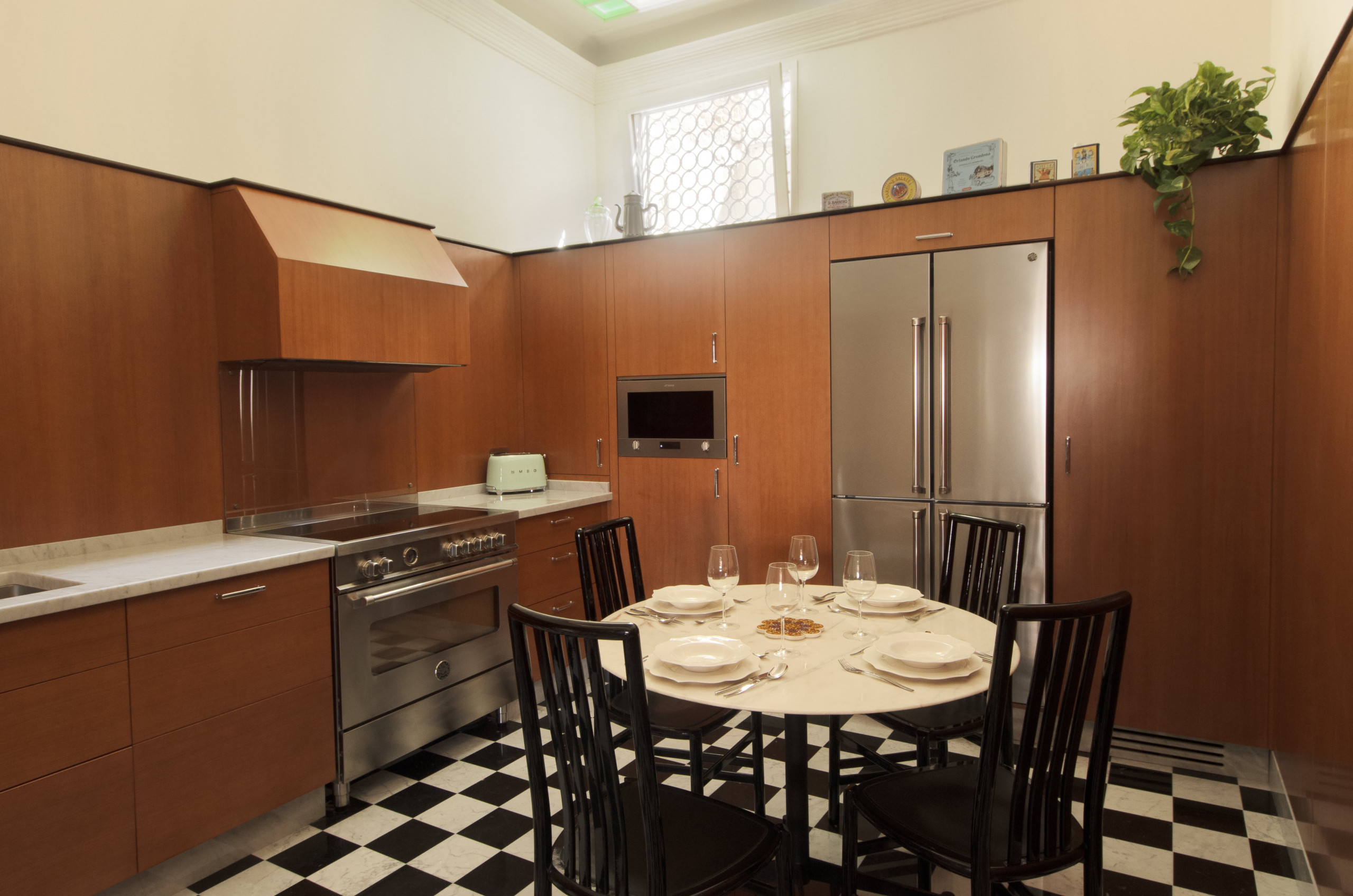 • Un’accogliente e ben attrezzata cucina/sala da pranzo con travi a vista, un scenografico marmorino rosso alle pareti e pavimenti in terrazzo veneziano; fornita di una cantinetta frigo per mantenere il vino alla giusta temperatura, un forno della Miele e una comoda panca più 5 sedie per potersi accomodare al tavolo da pranzo che può ospitare fino a 10 persone. Un secondo balcone aggiunge luce alla stanza.
