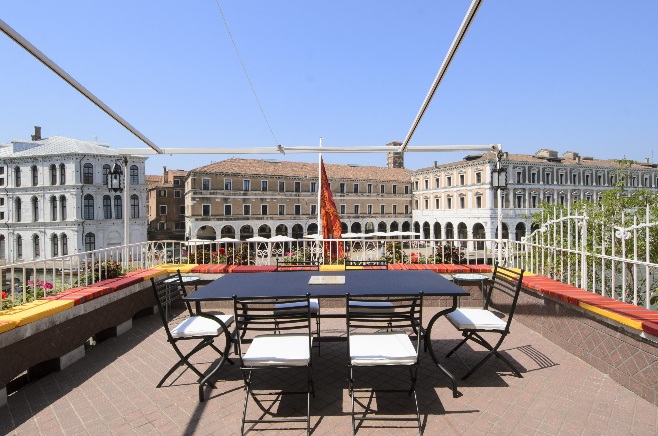 La Terrazza Grand Canal combines classic charm with modern comforts, featuring bright spaces, a panoramic terrace directly overlooking the Rialto Bridge, and refined details.