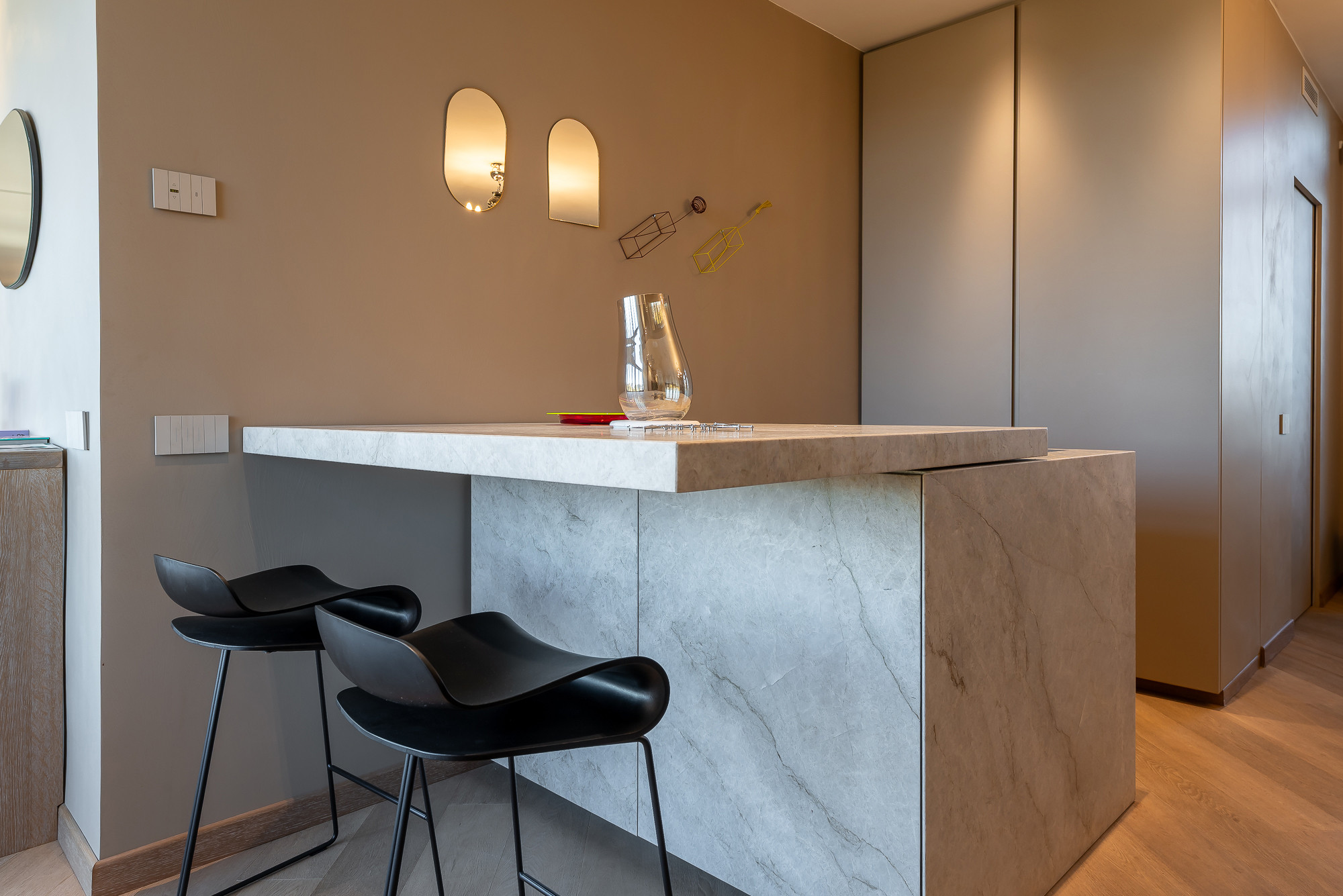 6th Floor – A refined living space featuring panoramic windows with built-in seating, oak floors, and a sleek marble kitchen with island and bar seating. The serene bedroom includes a premium 240×200 bed base with two 120×200 twin mattresses and a smart partition wall that can be opened or closed for complete privacy. The elegant marble bathroom is equipped with a walk-in rain shower.