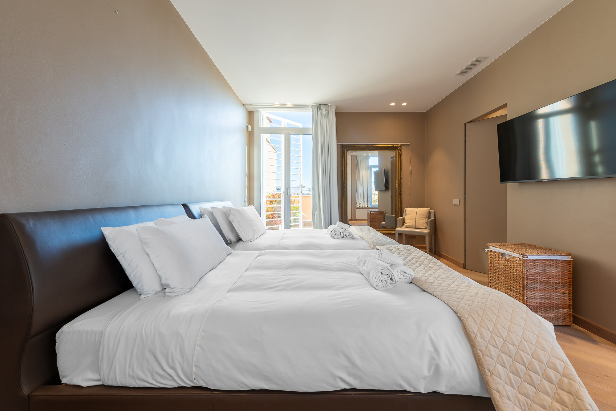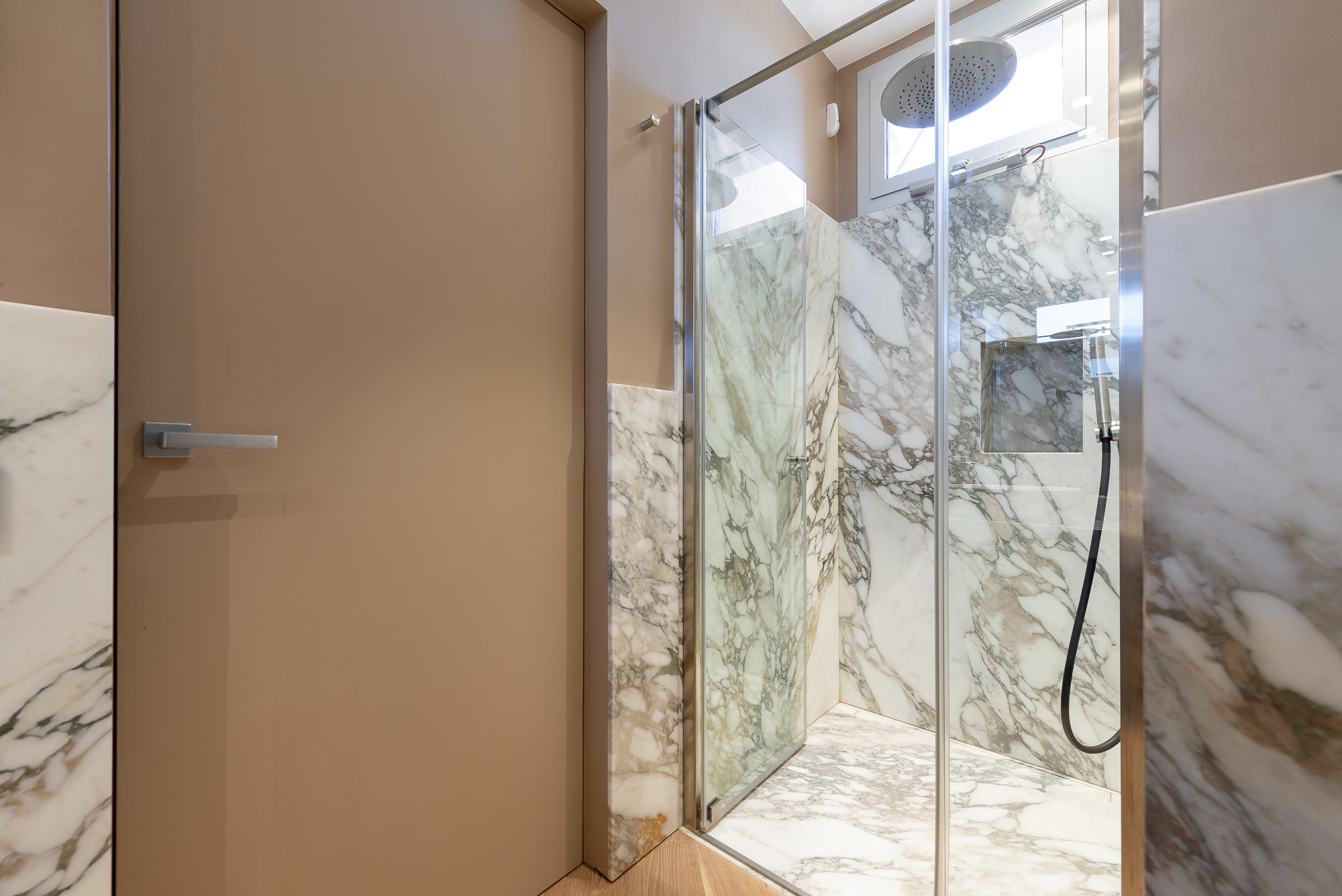 The rooftop terrace is designed for both relaxation and entertaining, offering a dining area, sun loungers, and an outdoor shower—perfect for enjoying breakfast in the morning light or an aperitivo at sunset, all in total privacy.
